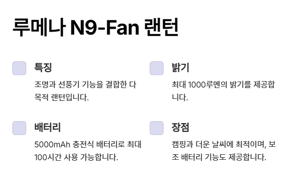 - 특징: 조명과 선풍기 기능을 결합한 다목적 랜턴.