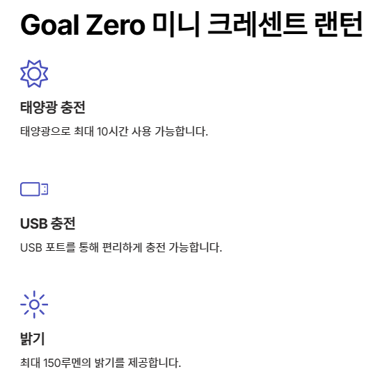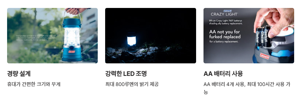 - 장점: 작고 가벼우며 텐트 내부 조명에 적합.